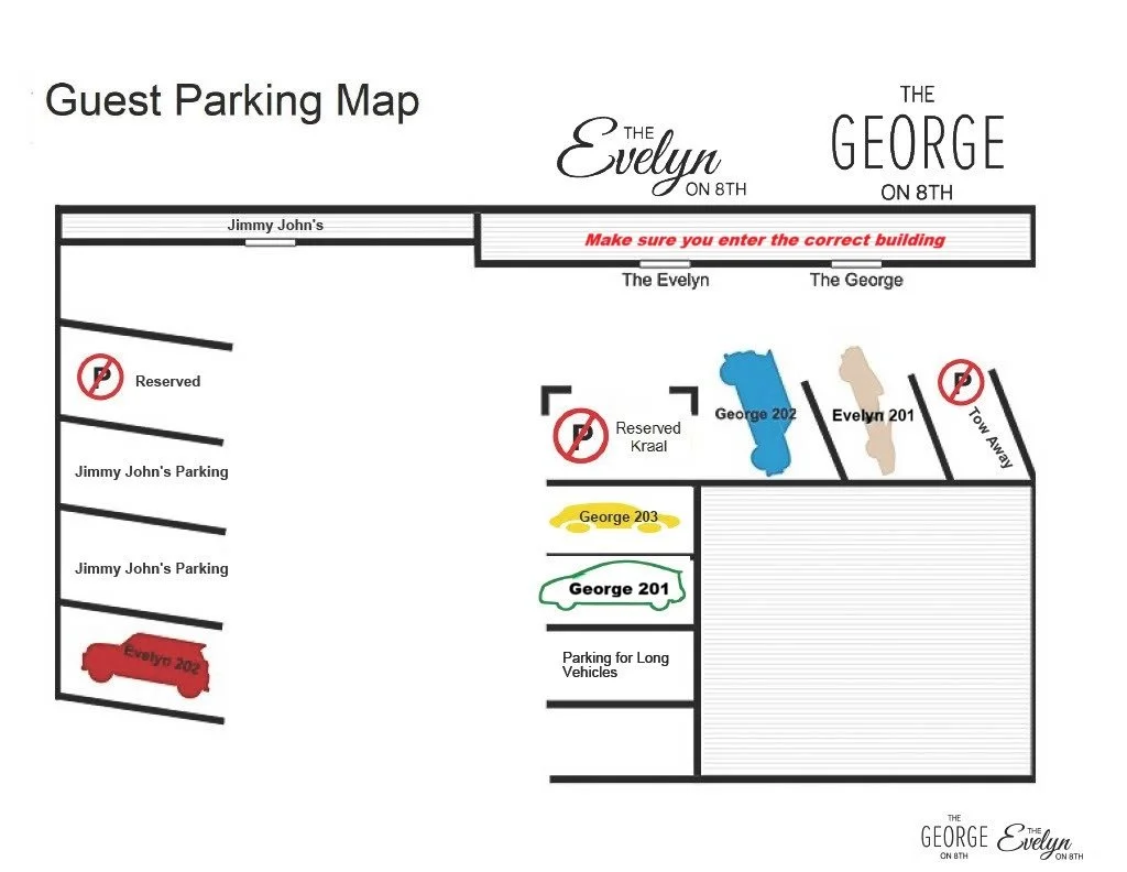 If you have a vehicle longer than 20', we will need you to use public parking or the unmarked spot adjacent to the Evelyn 201 reserved parking (see map). All additional vehicles in your party need to find alternate parking.